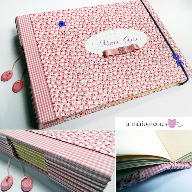 Álbum 23x16cm, forrado em tecido e folhas internas em papel vergê. Detalhe charmoso do botãozinho em forma de corujinha. |